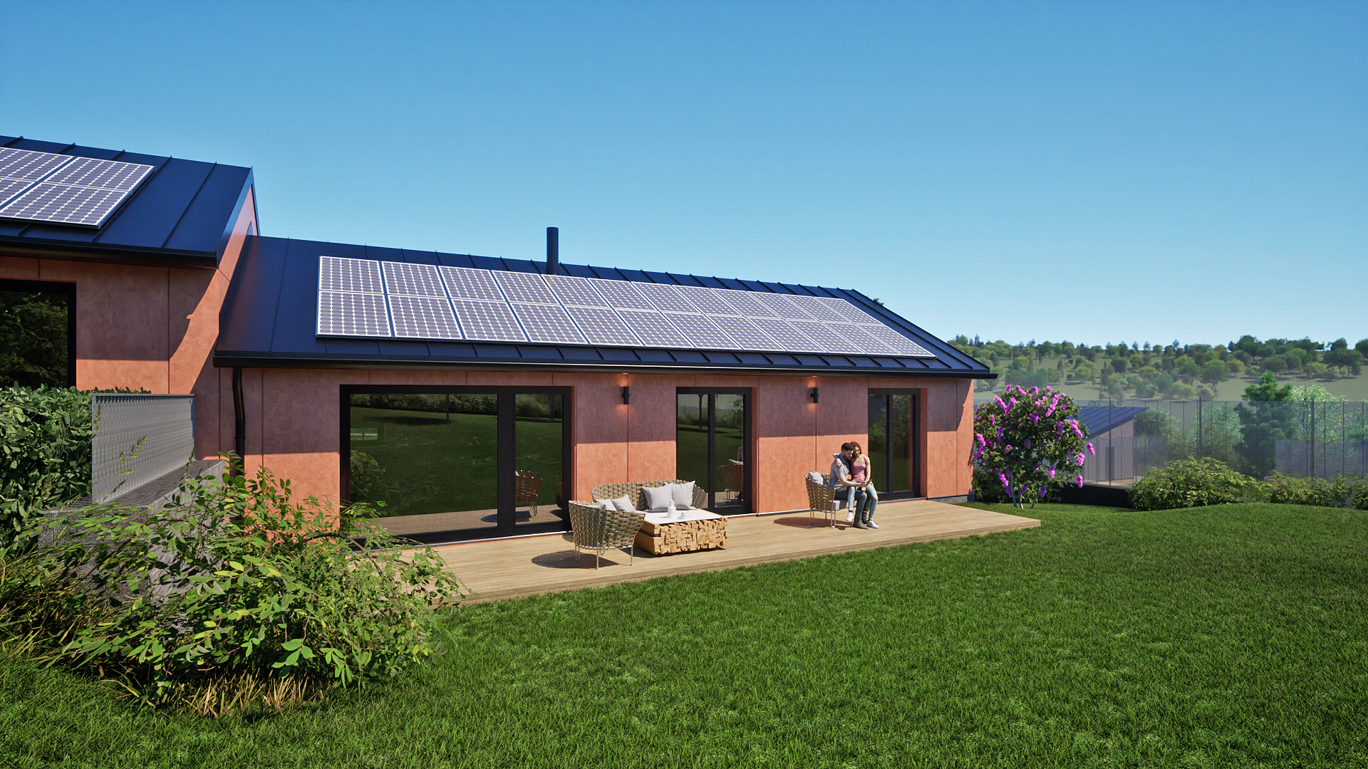 Nad částí půdorysu je technické patro lokálně přístupné z chodby, kde jsou umístěné technologie řízeného větrání s rekuperací, bateriové úložiště a ohřívač na teplou vodu. Obývací pokoj a obě ložnice mají přímý vstup na venkovní terasu a zahradu. Ke každému rodinnému domu patří sklad v obslužném objektu o velikosti 10.8 m².